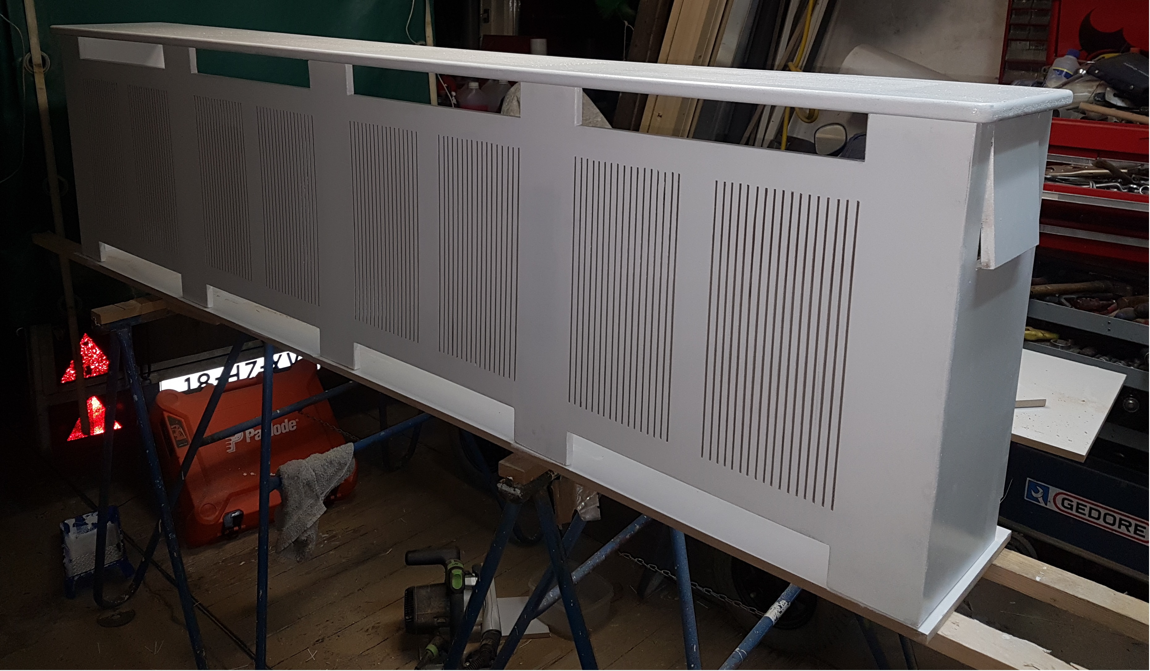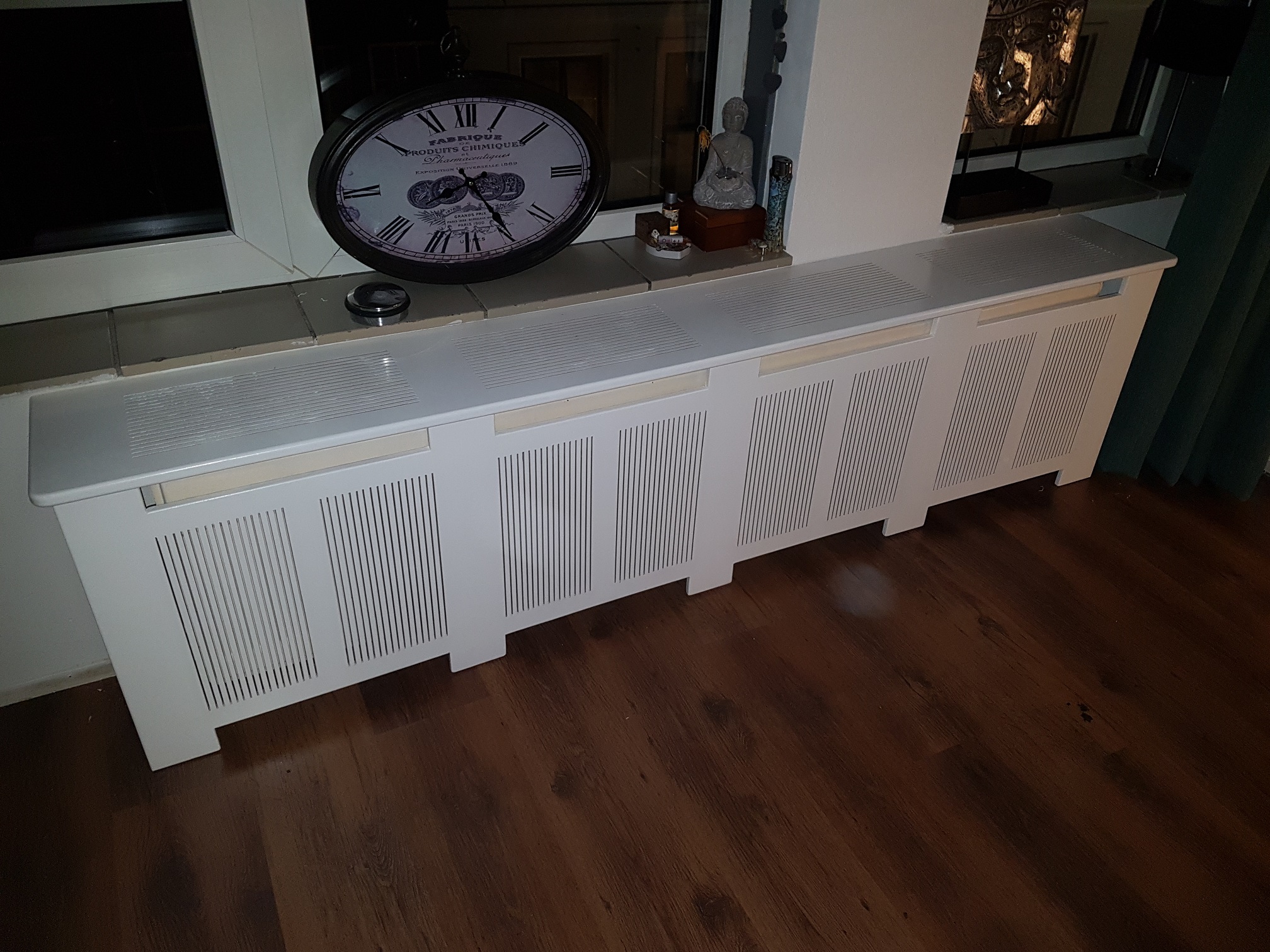 De klant vond de verwarming geen mooi gezicht, in plaats van een nieuwe verwarming te plaatsen is de verwarming mooi afgewerkt met een functionele ombouw. Deze ombouw is geheel op maat gemaakt, volledig zelf, elke vorm en ronding is in onze eigen werkplaats gemaakt.